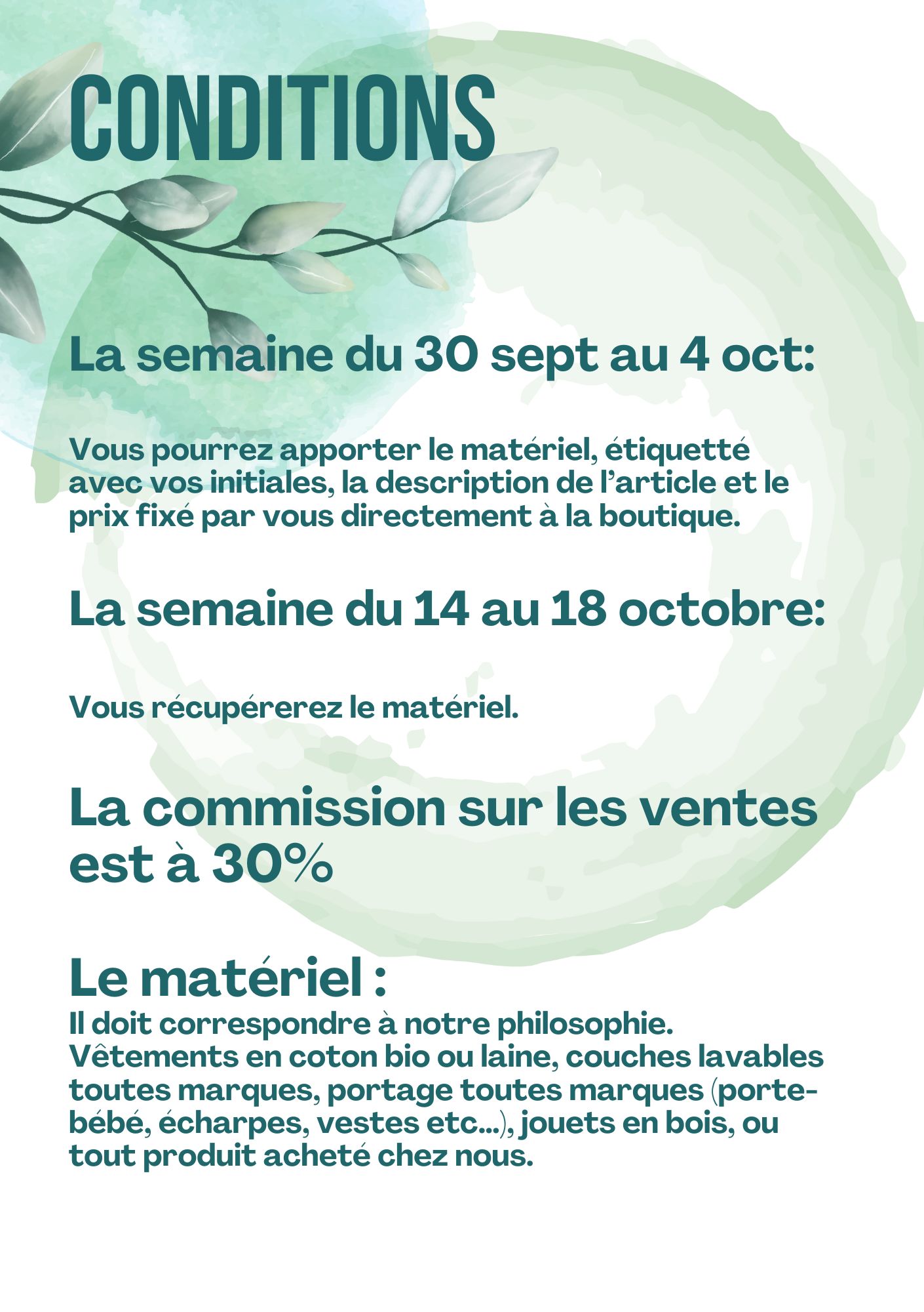 Le matériel accepté doit correspondre à notre philosophie. Vêtements en coton bio ou laine, couches lavables toutes marques, portage toutes marques (porte-bébé, écharpes, vestes etc…), jouets en bois, ou tout produit acheté chez nous.